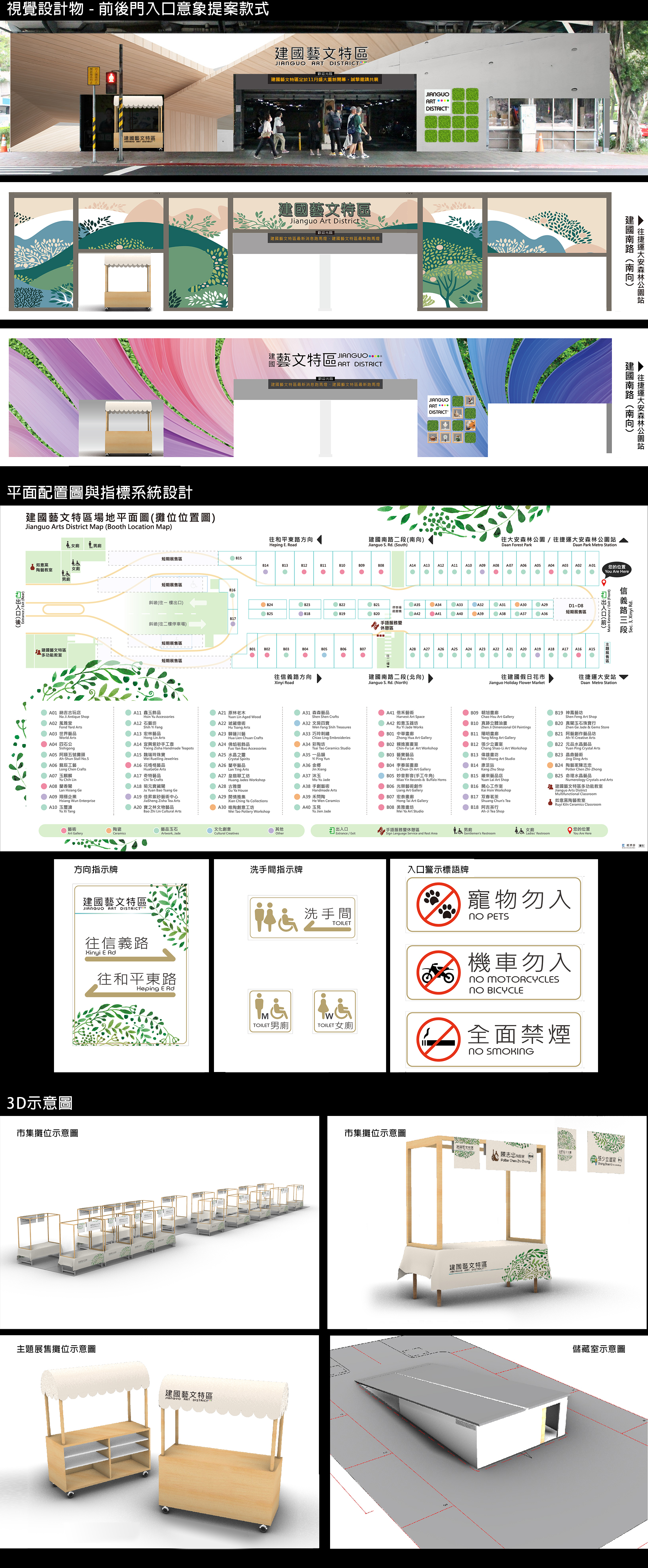 為協助臺北市建國藝文特區執行「113年傳統市集美學升級暨攤鋪優化輔導計畫」,本次優化改造涵蓋前後門入口意象重塑、燈殼字設計製作、木質主題攤車設計製作、平面圖與指標系統設計印製、攤位招牌與桌巾設計印製、攤位木架設計製作、休閒區與儲藏空間優化等多項內容。並運用3D立體示意圖輔助平面圖,與自治會、攤商及主管機關之間溝通。