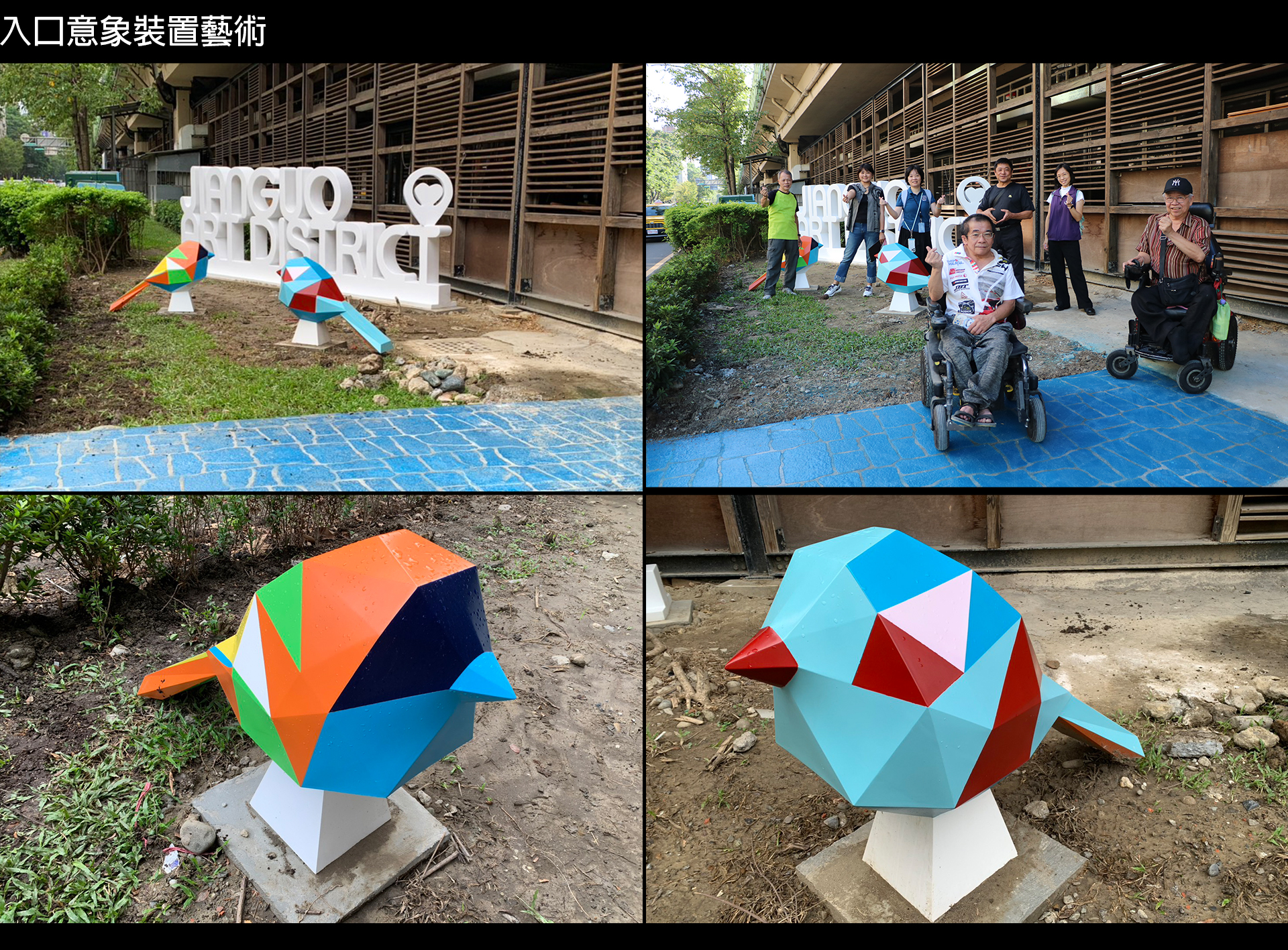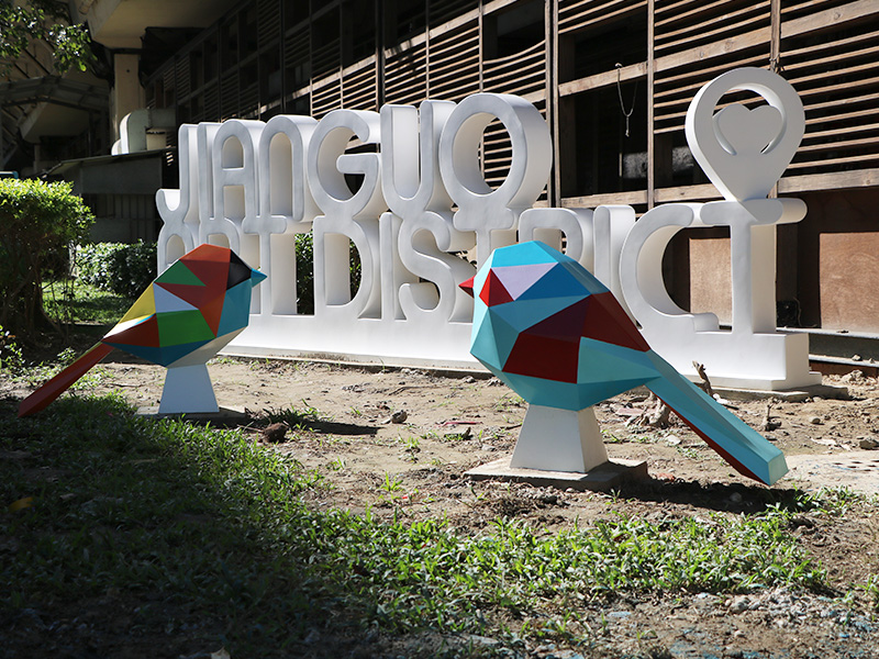 臺北市建國藝文特區參與臺北市市場處「114年度臺北市攤販集中場市集精進計畫」,為營造與加強整體印象,建置入口意象裝置藝術。富生達規劃設計在藝文特區入口綠帶增設建國藝文特區立體英文字樣,提升品牌能見度,同時加入兩只「彩色鳥」造型,營造親切、歡迎氛圍,並提醒大家共同為環保與永續盡一份心力。整體設計以質感、可愛且清新的風格呈現,打造獨具特色的入口意象裝置藝術,並在前方保留一小區域與市集一致的路鋪面,營造整體感。